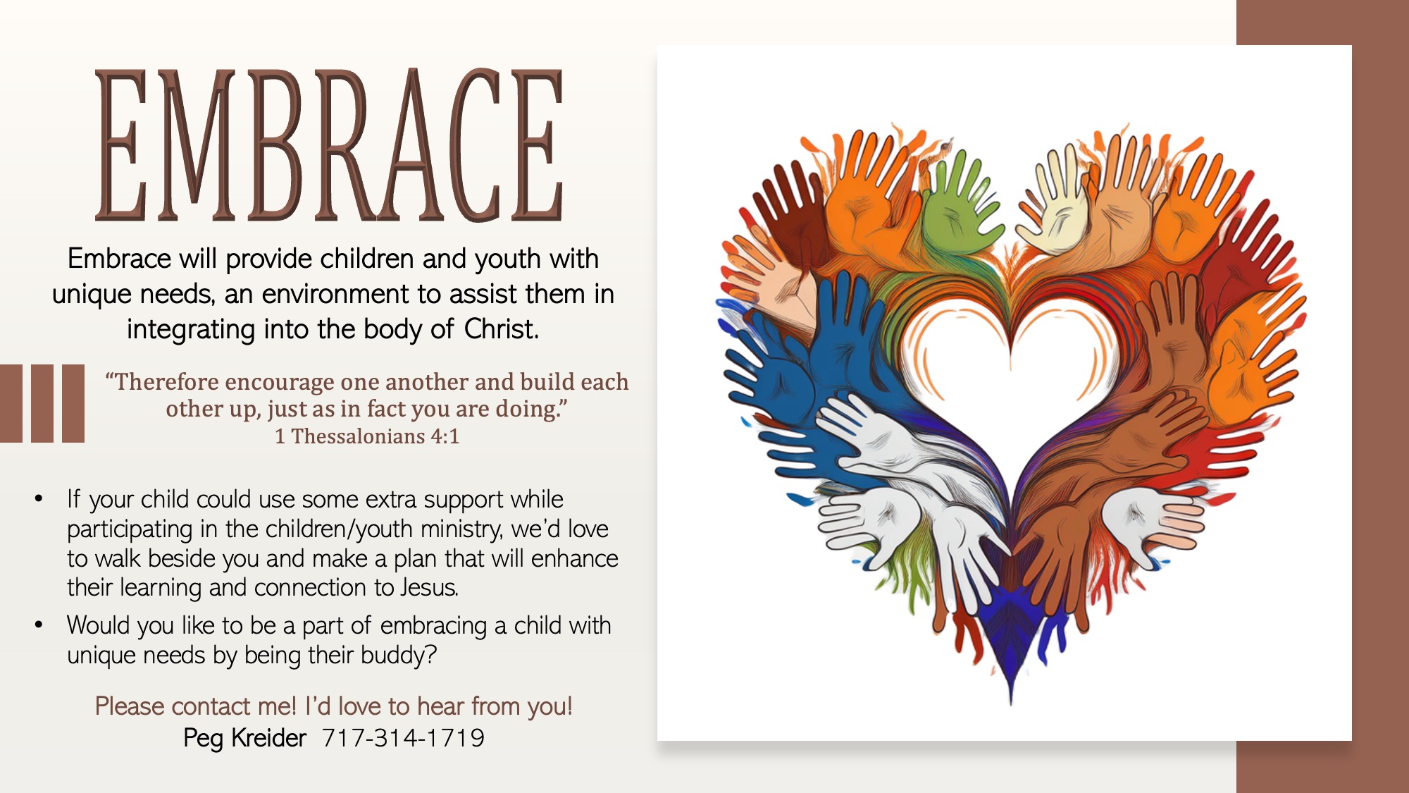 For more information about EMBRACE, please contact Peg Kreider.